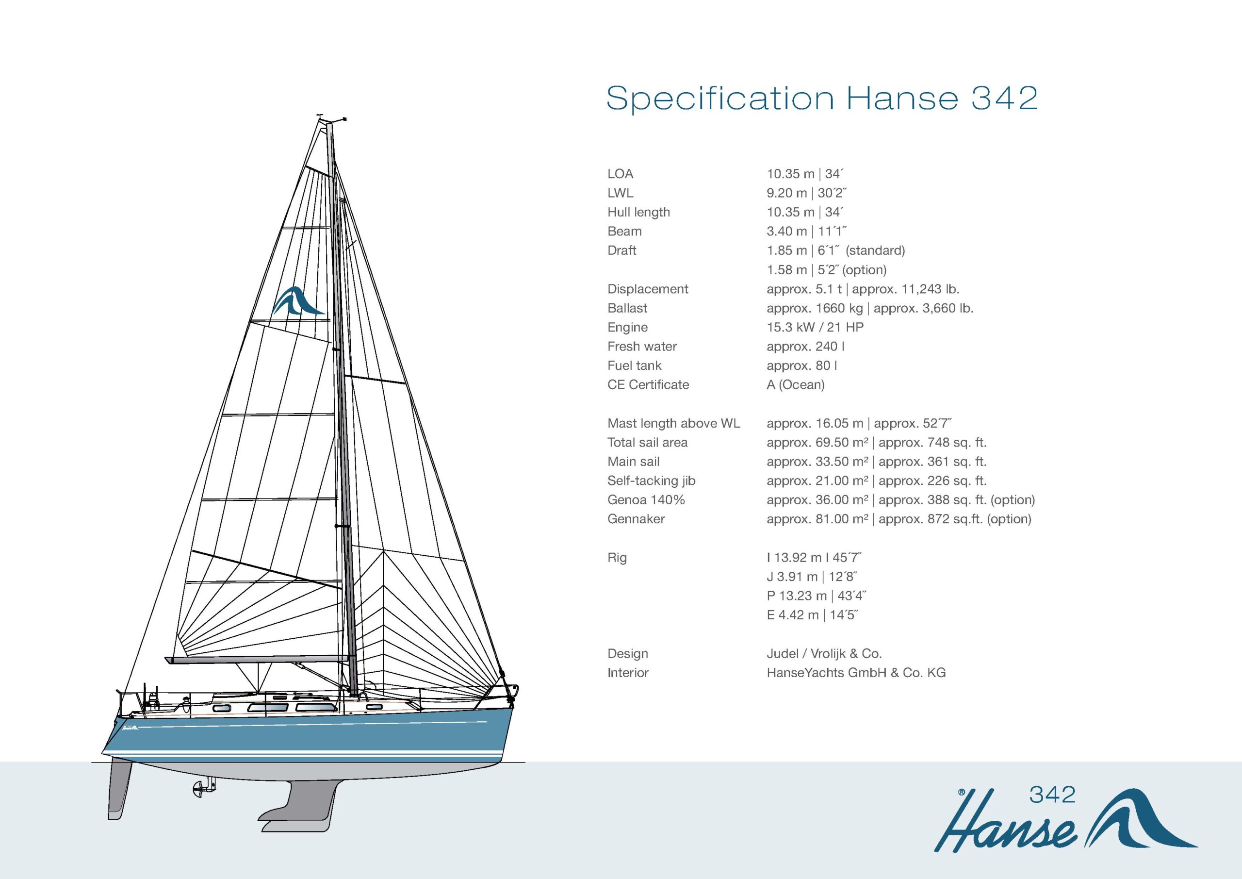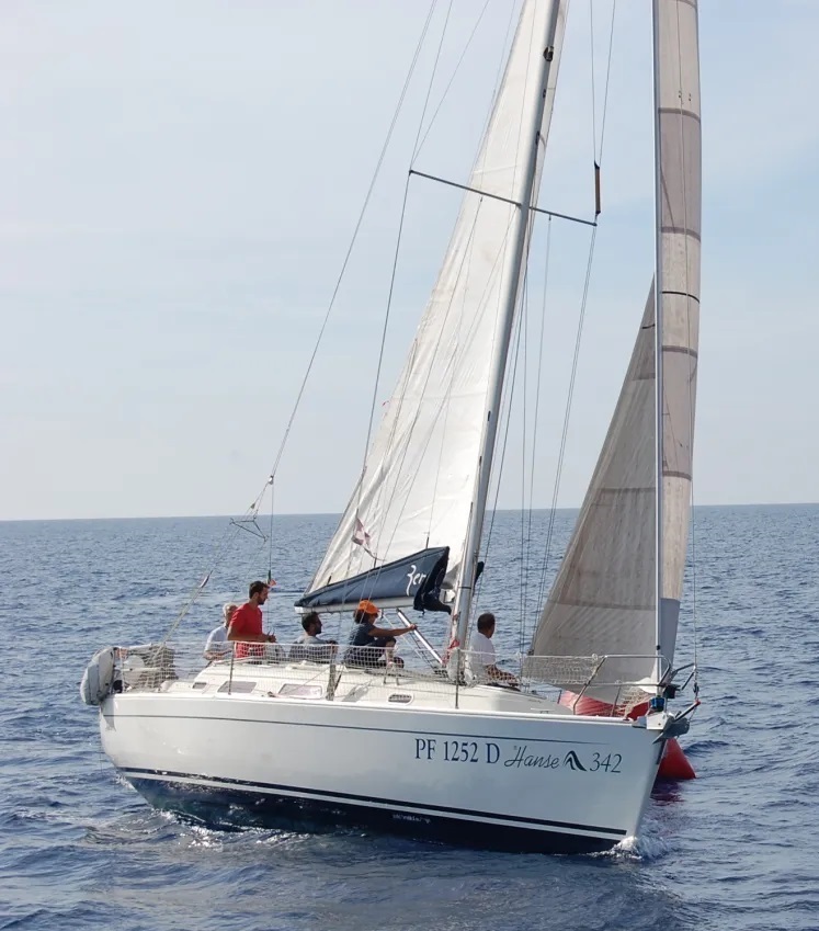 Ren –Scheda tecnica Barca a vela Hanse 342ModelloHanse – 342Anno2008Lunghezza10,36 mLarghezza3,40 mAllestimento internoGli interni si dividono in due cabine doppie, una a poppa e una a prua, un bagno, cucina a murata, tavolo da carteggio e ampio quadrato.